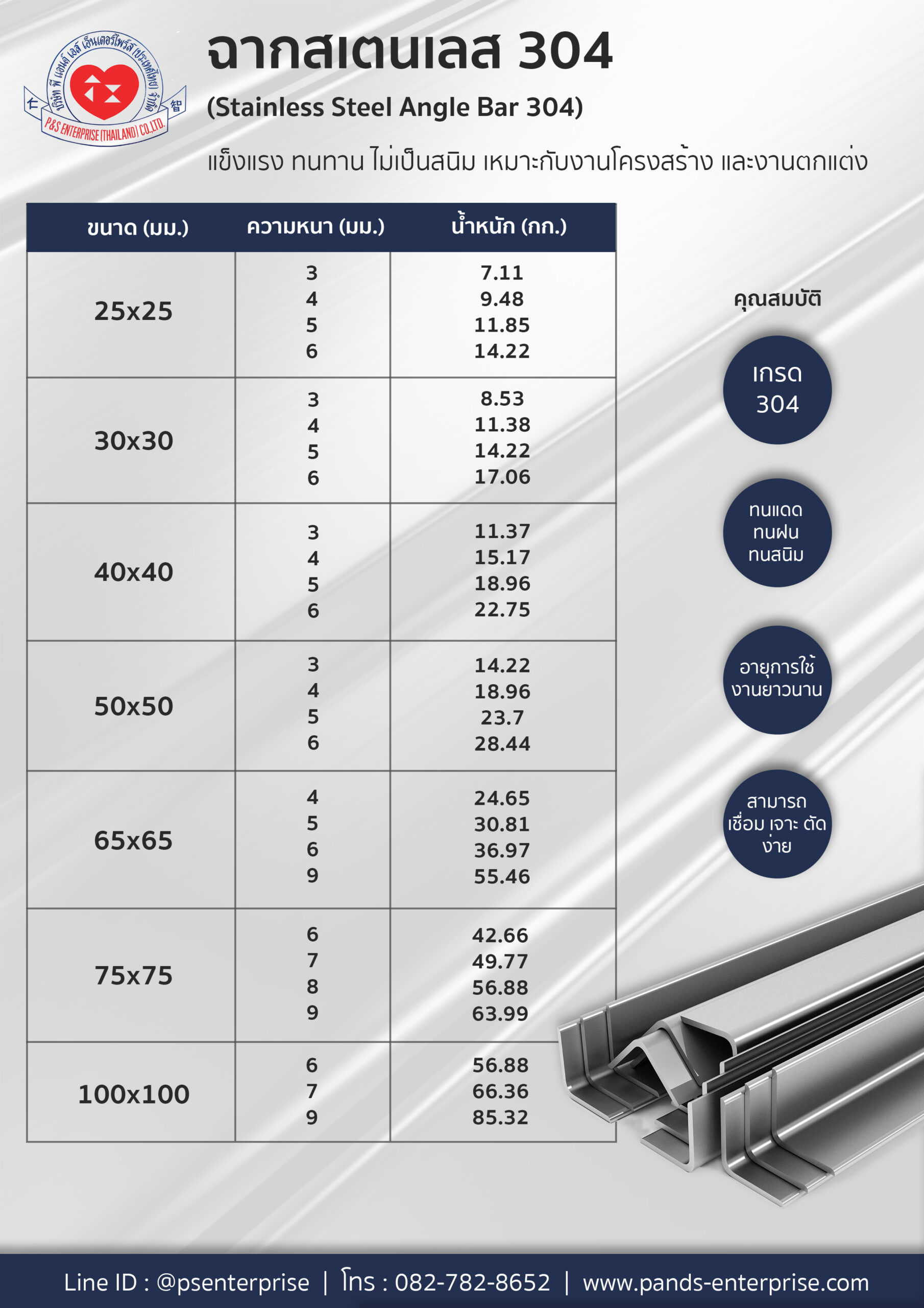 รายละเอียดสินค้า ความยาว : 6 เมตร ความกว้าง : 25 – 100 มม. หนา : 3 – 9 มม. เกรด : 304/316L